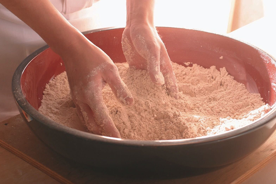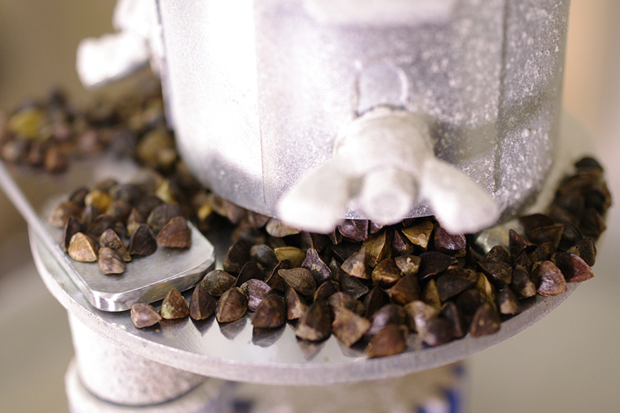 2種類の玄そばを自家工房にて製粉(石臼挽きの挽きぐるみ)。
